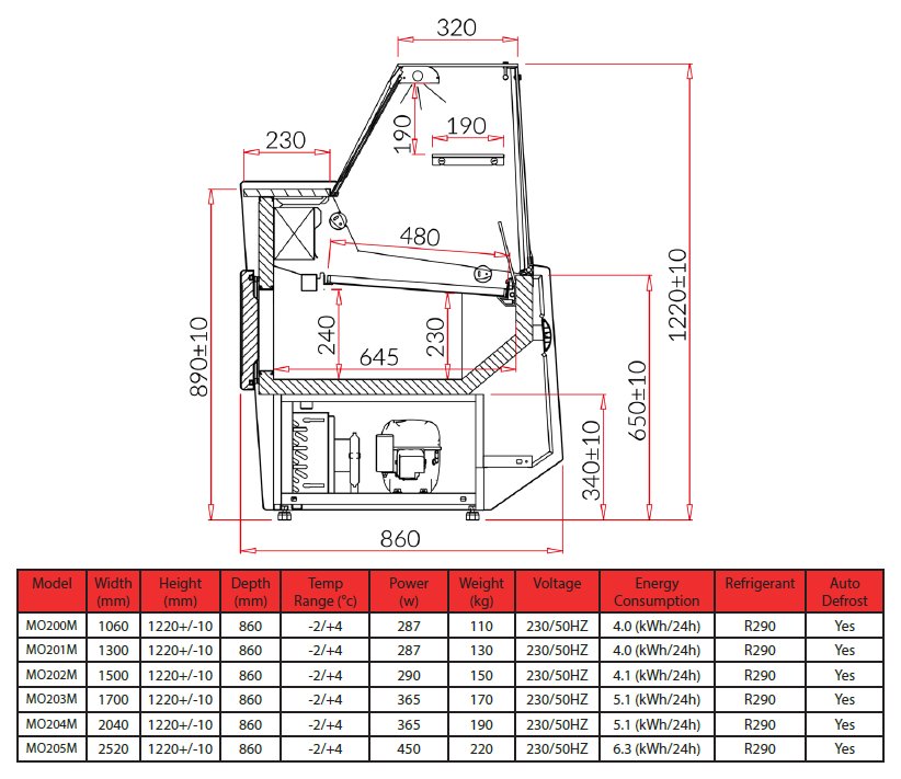 Straight front glass. Rear sliding Perspex doors. Front glass defogger.