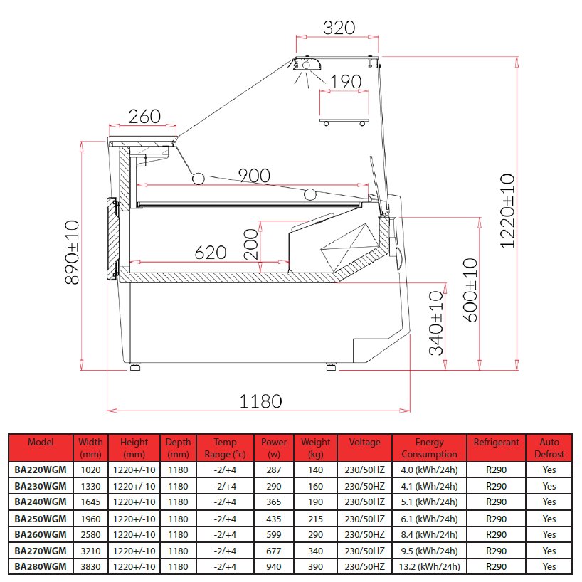 Straight front glass. Rear sliding perspex doors. Front glass defogger. White LED lighting.