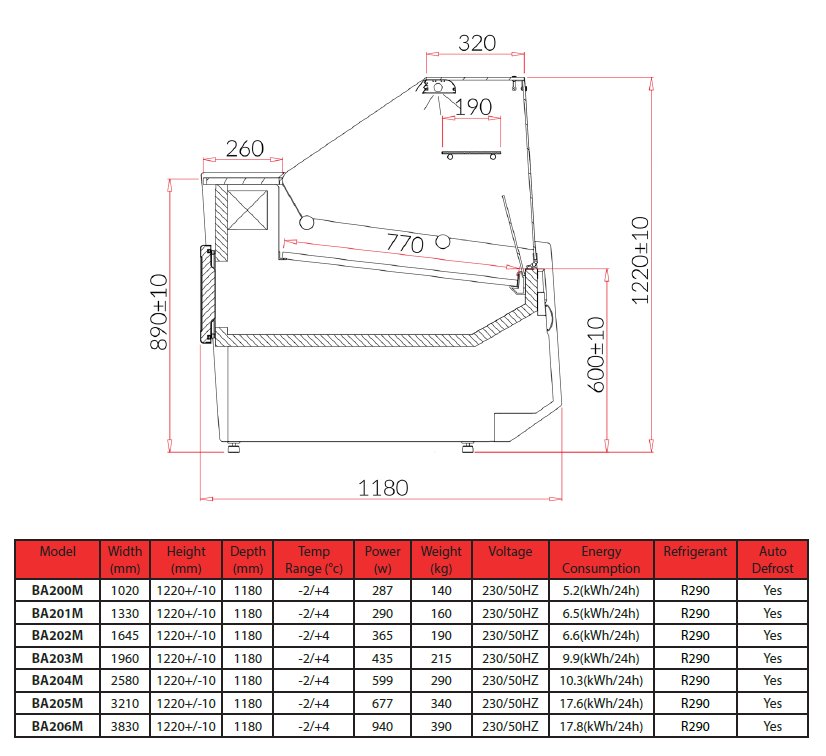 Straight front glass. Rear sliding perspex doors. Front glass defogger. White LED lighting.