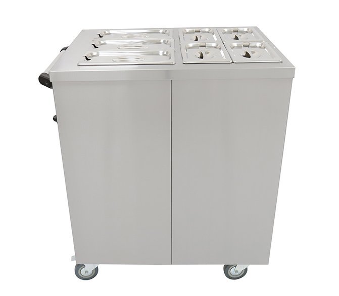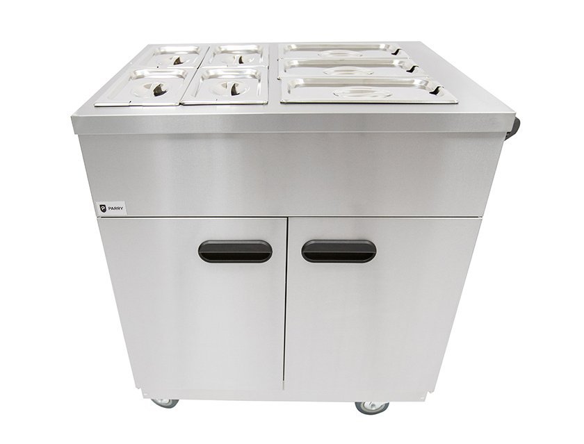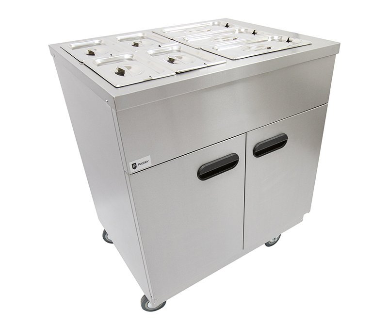 The Parry 1887 Mobile Hot Cupboard Servery or Hot Food Trolley is a heavy-duty bain marie top heated cabinet with a double skinned stainless steel construction. The thermostatically controlled hot cupboard keeps 30 plated meals at safe and hygienic temperatures while the bain marie top has a 4 x 1/4 and 3 x 1/3 GN capacity. The simmerstat controlled dry heat bain marie features independently controlled bain marie wells, ideal for serving piping hot pre-cooked meals such as beans, gravy, curry and vegetables. Durable lockable castors make this unit highly manoeuvrable and safe when locked into place. This robust unit is well suited for use in care homes, nursing homes, canteens and restaurants.