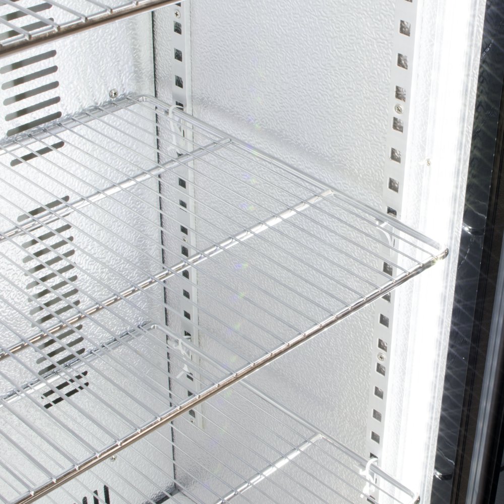 Features a hard wearing black powder coated exterior and a breath taking mirror finish interior which draws the customer's eye to the cooler. The cabinet is fitted with pure white energy efficient twin vertical LED lighting to brilliantly illuminate the contents and benefits from forced air cooling for rapid cooling. 5 adjustable chrome shelves offer the flexibility to store any size of bottle and a lockable door adds security.