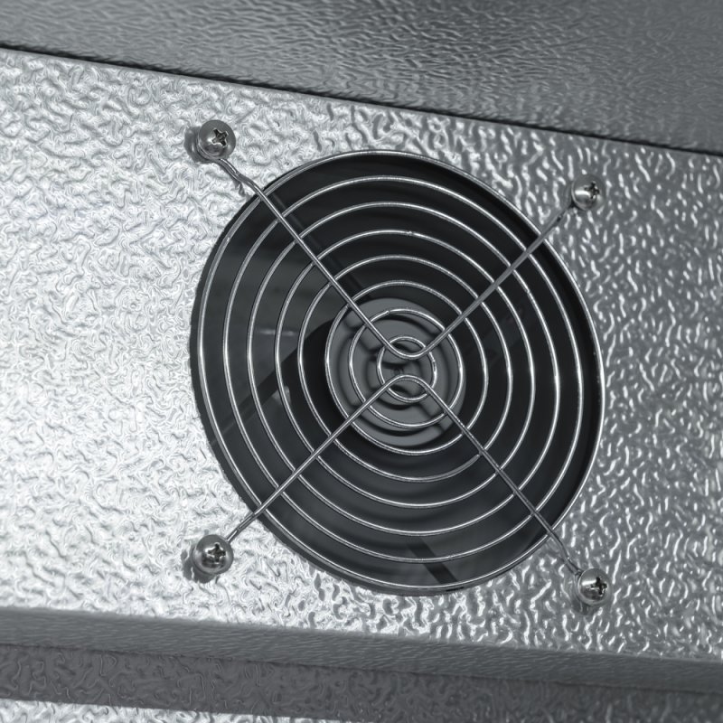 A sleek, triple-door, low-energy under-counter bottle cooler designed for efficiency and durability. It boasts a black exterior finish finish with an easy-to-clean aluminium interior, complemented by six adjustable chrome shelves to optimize storage.