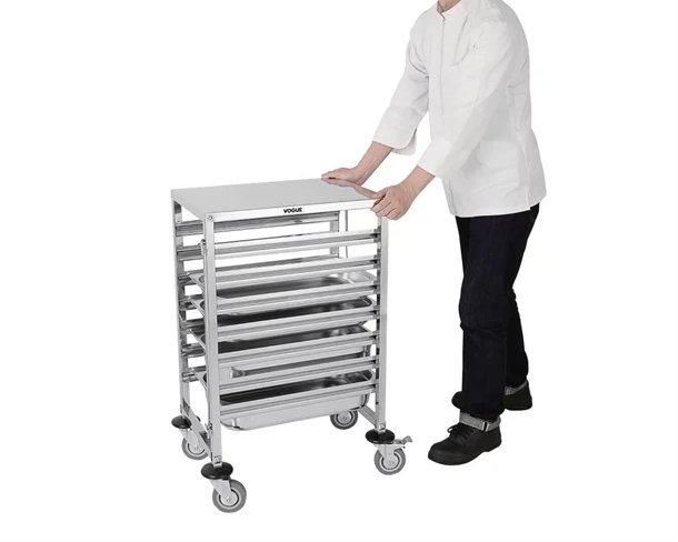 Its 7 shelves hold standard 1/1 Gastronorm pans securely.