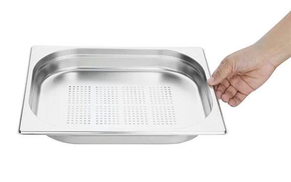Perforated gastronorm tray, ideal for cooking, steaming and serving vegetables.