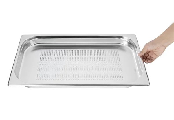Perforated gastronorm tray, ideal for cooking, steaming and serving vegetables.