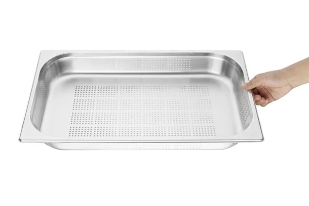 Perforated gastronorm tray, ideal for cooking, steaming and serving vegetables.